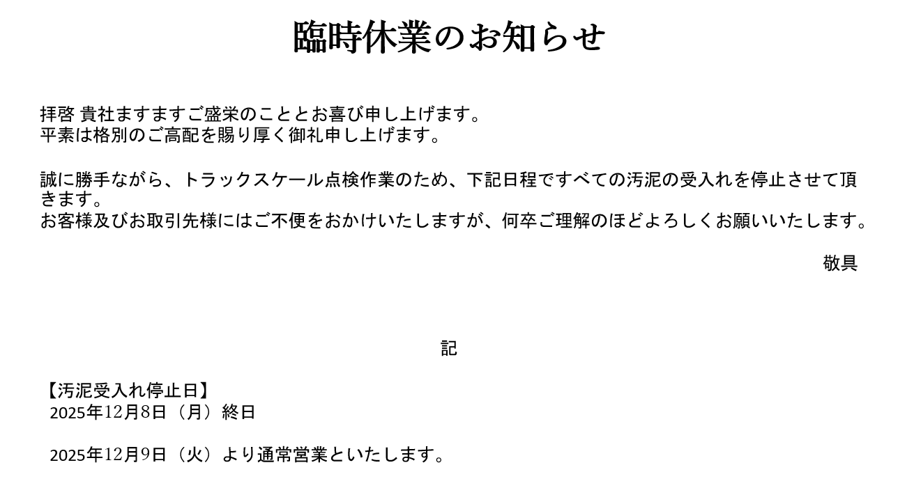 | 営業種目 | 総合建設請負業・土質改良工事業・産業廃棄物処理業 |